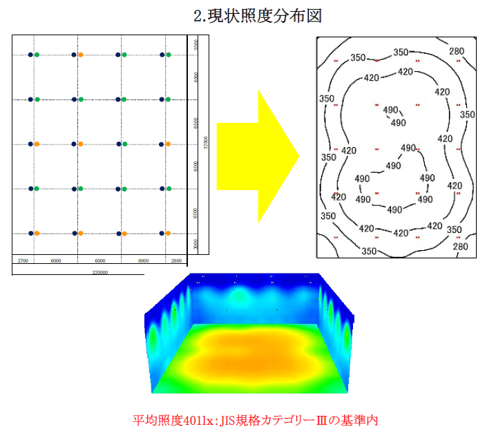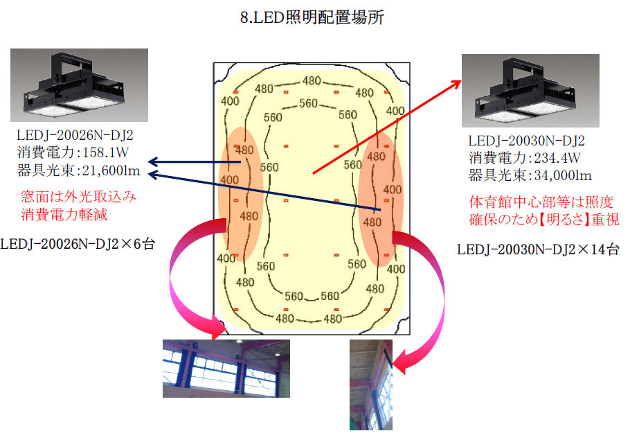 体育館のLED省エネ化 ※写真はイメージです 対応エリア:北海道札幌市施設名:体育館施工箇所:体育館の高天井用照明(30台)水銀灯の生産中止を機にLED導入を決められたとのこと。 水銀灯に比べ、点灯までに時間がかからずすぐに点き、交換の頻度も少なくなるので助かると喜びの声を頂きました。照明を外光が入る窓面と明るさ重視の中心部に分け、2種類の高天井LED照明をご提案。 館内レイアウトに合わせてLEDのタイプを選定し、消費電力を抑えた無駄のないLED化計画をご提案させていただきました。投資コスト投資コスト投資回収期間6,900,000円998,050円7.0年照明士によるLED照明導入の改善提案照明士によるLED照明導入の改善提案