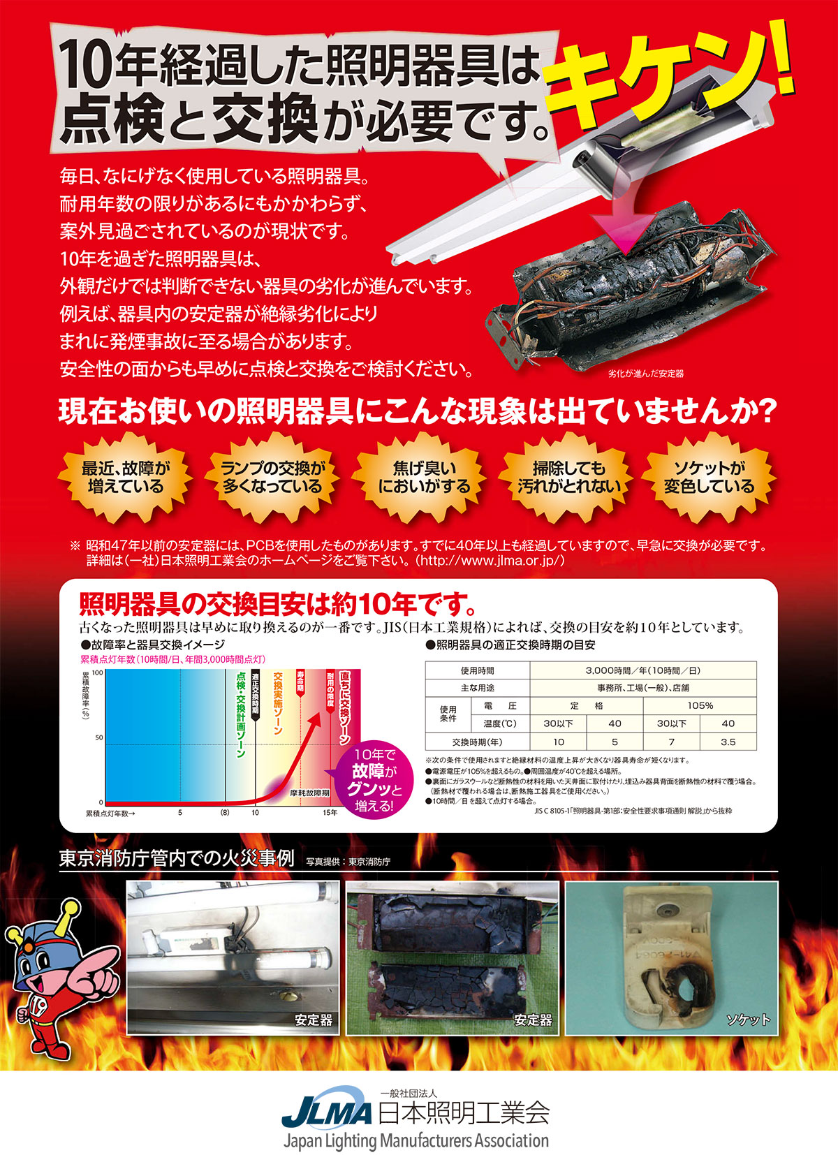 LED照明交換はひとつ間違えると大事故!?照明交換で注意すべきこととは… 発煙発火感電落下原因・LEDランプ種別選択の誤り・施工方法の間違い ・器具(ソケット)の絶縁性能不足 ・継続使用した安定器の劣化 など原因・通電しながらのランプ交換原因・継続使用したソケットの劣化 ・ランプの質量超過 ・異常発生時のソケットの熱変形発煙発火原因LEDランプ種別選択の誤り・施工方法の間違い器具(ソケット)の絶縁性能不足継続使用した安定器の劣化 など感電原因通電しながらのランプ交換落下原因継続使用したソケットの劣化ランプの質量超過異常発生時のソケットの熱変形 『ランプだけを交換すればずっと使える』と思われている方、お気をつけください。照明器具は10年経てば黄信号、15年経ったら赤信号です。 ランプ以外の照明器具も目に見えないだけで、劣化しています。 焦げ臭いにおいがするソケット部分が変色している安定器が発する熱による ラベル焦げ付き ランプが黒化している原因不明の故障の増加焦げ付いた安定器の内部 ランプ交換回数の増加ランプのちらつき増加発火した安定器 これらの現象が起きている場合は安定器の寿命が間近の状態です。LED直管型工事不要タイプの例長所・手軽にLED化 ・工事できない箇所への対応 ・工事代金軽減 ・退去時、簡単に現状復旧可能 短所・安定器を通すため通常LED照明より節電効果が期待できない・安定器を通すためランプ自体に負荷が掛り電源部分不具合発生 安定器負荷が掛り器具本体も不具合の発生 ⇒安定器故障のため、既存ランプも使用できなくなる ・過電流防止ヒューズが導入されているか不明 特にFHFの場合、安定器は数千種類有するため適合するか否か不明 ⇒不適合の場合、器具本体の故障発生の可能性あり ・既存蛍光灯、一般的LED照明より重いため、照明器具ソケットへの負荷 ⇒落下の可能性あり 照明器具に負荷を掛けているため発火(ファイヤー)の危険性あり 長所手軽にLED化工事できない箇所への対応工事代金軽減退去時、簡単に現状復旧可能短所安定器を通すため通常LED照明より節電効果が期待できない安定器を通すためランプ自体に負荷が掛り電源部分不具合発生 安定器負荷が掛り器具本体も不具合の発生 ⇒安定器故障のため、既存ランプも使用できなくなる過電流防止ヒューズが導入されているか不明 特にFHFの場合、安定器は数千種類有するため適合するか否か不明 ⇒不適合の場合、器具本体の故障発生の可能性あり既存蛍光灯、一般的LED照明より重いため、照明器具ソケットへの負荷 ⇒落下の可能性あり 照明器具に負荷を掛けているため 発火(ファイヤー)の危険性あり 一般社団法人日本照明工業会でも10年経過した照明器具の点検・交換を呼び掛けています。引用:一般社団法人日本照明工業会≫ LED交換についてはこちら